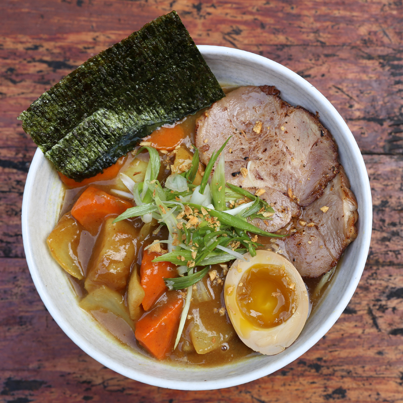 Iconic Japanese Curry mixed with flavorful Tonkotsu broth creates this tasty Curry Ramen. Topped with choice of Chashu or Kakuni and garnished with fresh green onions, half soft boiled egg, and nori.
