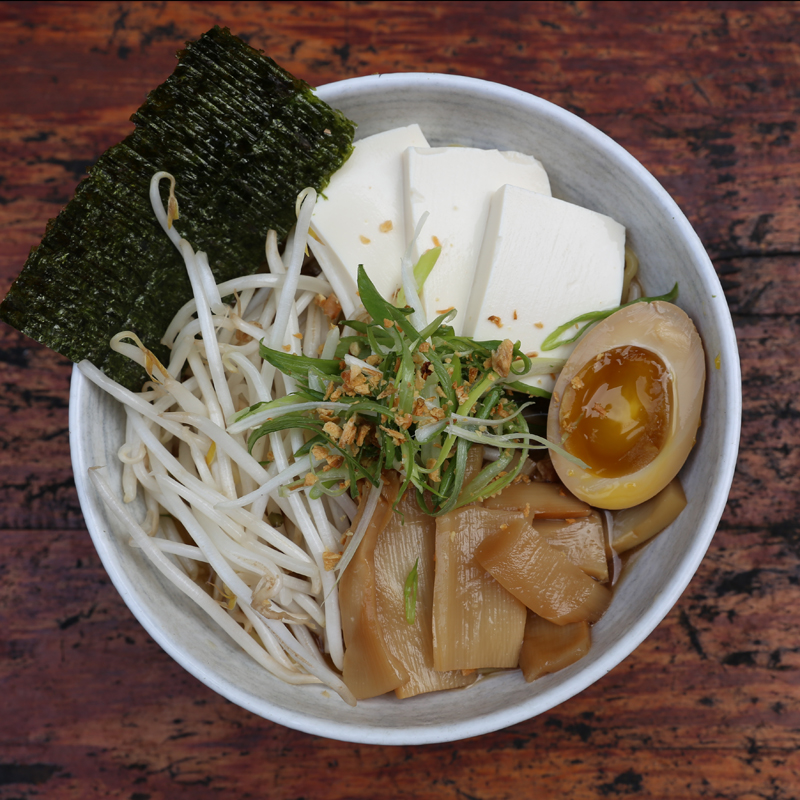 Miso Vegan Ramen which comes with soy-chashu, tofu, seaweed, bamboo shoots, and green onions.