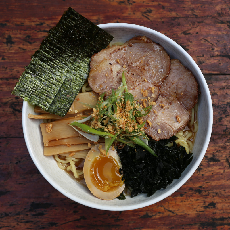 Creamy Miso Broth Ramen with choice of Chashu or Kakuni and topped with bamboo shoots, seaweed, green onions, half soft boiled egg, and nori.