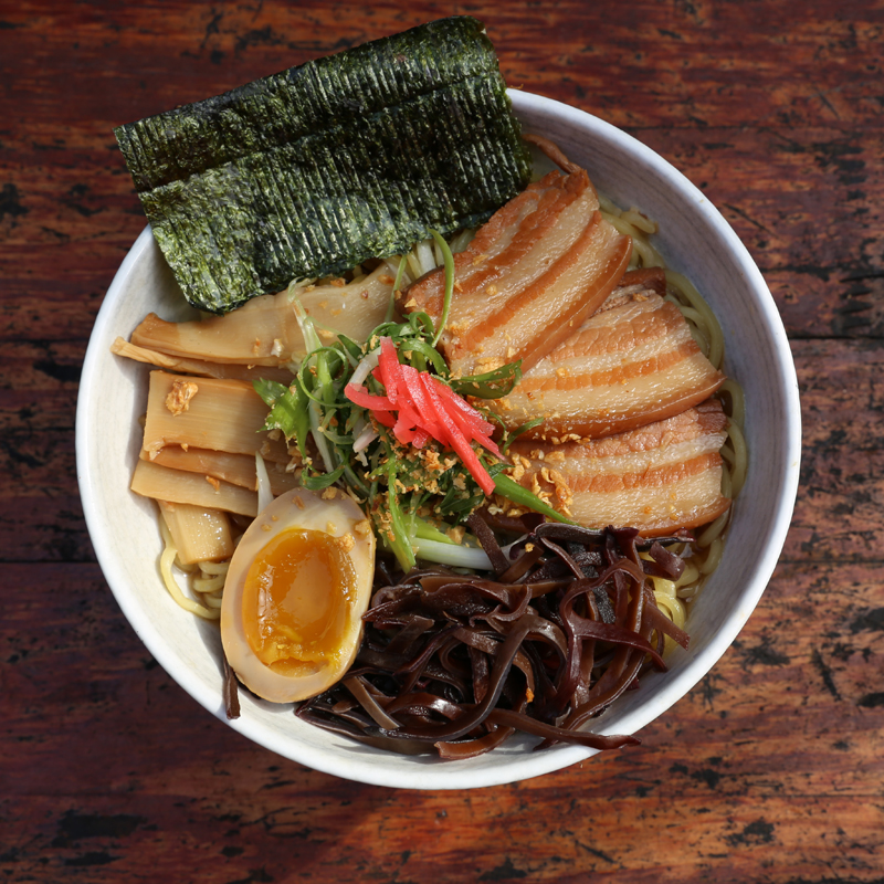 Rich and milky flavorful pork-chicken soup base boiled in the pot for 15 hours. Serve with chashu or kakuni and tops with half soft boiled egg, fungus, bamboo, and green onions